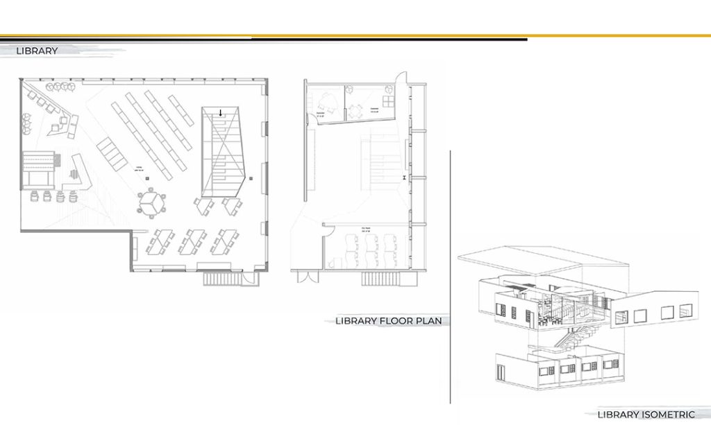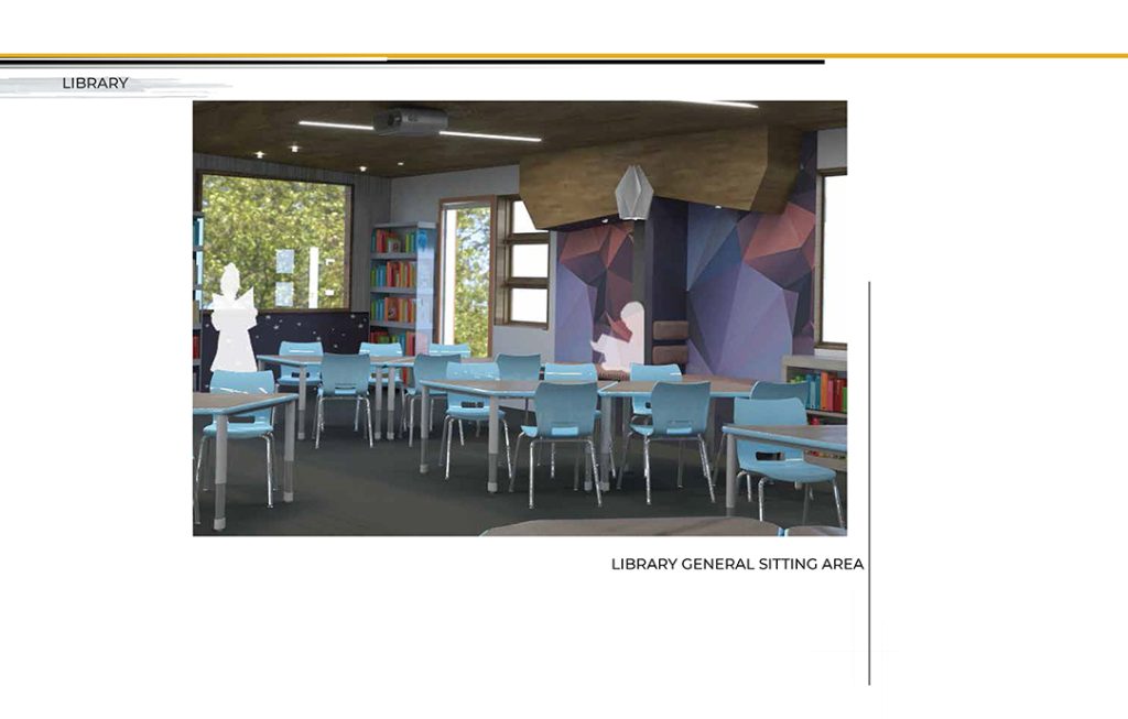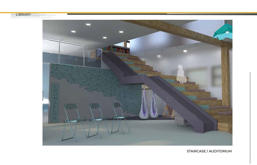 The existing library, already a central hub for learning, was reimagined as the heart of the school—unique, inviting, and alive with possibility. From here, connections extend to the ESL classroom and the counsellor’s office, united by an extraordinary feature: a slide paired with a staircase that doubles as a petite, informal auditorium. It’s a playful yet functional design choice, inviting both movement and community gatherings.